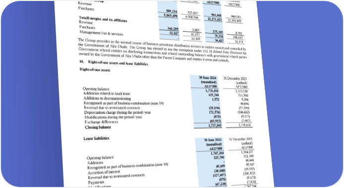 ABU DHABI NATIONAL OIL COMPANY FOR DISTRIBUTION PJSC Notes to the interim condensed consolidated financial statements for the six-month period ended 30 June 2024 (continued) 9. Related party balances and transactions (continued) Related party transactions: 3 months ended 30 June 6 months ended 30 June 2024 2023 2024 2023 (unaudited) (unaudited) (unaudited) (unaudited) AED’000 AED’000 AED’000 AED’000 ADNOC Group Revenue 509,154 525,837 961,608 969,583 Purchases 5,865,490 6,500,566 12,271,623 12,293,893 TotalEnergies and its affiliates Revenue 144,289 3,005 275,169 8,592 Purchases 52,827 41,157 79,334 108,632 Management Fee & services - 24,305 36,427 31,373 The Group provides in the normal course of business petroleum distribution services to entities owned and controlled by the Government of Abu Dhabi. The Group has elected to use the exemption under IAS 24 Related Party Disclosures for Government related entities on disclosing transactions and related outstanding balances with government related parties owned by the Government of Abu Dhabi other than the Parent Company and entities it owns and controls. 10. Right-of-use assets and lease liabilities Right-of-use assets 30 June 2024 31 December 2023 (unaudited) (audited) AED’000 AED’000 Opening balance 1,778,418 1,373,338 Additions related to land lease 125,780 511,560 Additions to decommissioning 1,572 9,394 Recognised as part of business combination (note 19) - 98,694 Reversal due to terminated contracts (28,836) (51,316) Depreciation charge during the period/year (72,576) (146,412) Modifications during the period/year (878) (9,173) Exchange differences (65,915) (7,667) Closing balance 1,737,565 1,778,418 Lease liabilities 30 June 2024 31 December 2023 (unaudited) (audited) AED’000 AED’000 Opening balance 1,747,264 1,314,327 Additions 125,780 511,560 Recognised as part of business combination (note 19) - 98,694 Accretion of interest 49,699 95,567 Reversal due to terminated contracts (30,680) (55,515) Payments (127,607) (200,322) Modifications (878) (9,173) Exchange differences (67,236) (7,874) Closing balance 1,696,342 1,747,264 Current Non-current 30 June 2024 31 December 2023 30 June 2024 31 December 2023 AED’000 AED 000 AED’000 AED 000 (unaudited) (audited) (unaudited) (audited) Lease liabilities 186,428 183,013 1,509,914 1,564,251 17