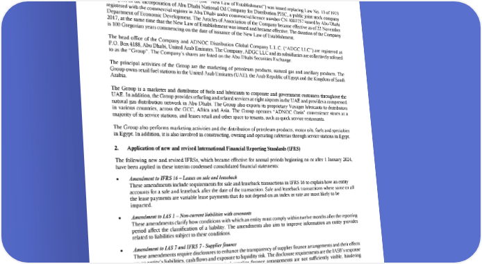 ABU DHABI NATIONAL OIL COMPANY FOR DISTRIBUTION PJSC Notes to the interim condensed consolidated financial statements for the six-month period ended 30 June 2024 1. General information Abu Dhabi National Oil Company for Distribution PJSC (“ADNOC Distribution” or the “Company”), formerly Abu Dhabi National Oil Company for Distribution, is a company incorporated by Law No. 13 of 1973 issued by His Highness the Acting Ruler of the Emirate of Abu Dhabi. On 22 November 2017, Law No. 15 of 2017 (the “New Law of Establishment”) was issued replacing Law No. 13 of 1973 in respect of the incorporation of Abu Dhabi National Oil Company for Distribution PJSC, a public joint stock company registered with the commercial register in Abu Dhabi under commercial licence number CN-1002757 issued by Abu Dhabi Department of Economic Development. The Articles of Association of the Company became effective as of 22 November 2017, at the same time that the New Law of Establishment was issued and became effective. The duration of the Company is 100 Gregorian years commencing on the date of issuance of the New Law of Establishment. The head office of the Company and ADNOC Distribution Global Company L.L.C. (“ADGC LLC”) are registered at P.O. Box 4188, Abu Dhabi, United Arab Emirates. The Company, ADGC LLC and its subsidiaries are collectively referred to as the “Group”. The Company’s shares are listed on the Abu Dhabi Securities Exchange. The principal activities of the Group are the marketing of petroleum products, natural gas and ancillary products. The Group owns retail fuel stations in the United Arab Emirates (UAE), the Arab Republic of Egypt and the Kingdom of Saudi Arabia. The Group is a marketer and distributor of fuels and lubricants to corporate and government customers throughout the UAE. In addition, the Group provides refueling and related services at eight airports in the UAE and provides a compressed natural gas distribution network in Abu Dhabi. The Group also exports its proprietary Voyager lubricants to distributors in various countries, across the GCC, Africa and Asia. The Group operates “ADNOC Oasis” convenience stores at a majority of its service stations, and leases retail and other space to tenants, such as quick service restaurants. The Group also performs marketing activities and the distribution of petroleum products, motor oils, fuels and specialties in Egypt. In addition, it is also involved in constructing, owning and operating cafeterias through service stations in Egypt. 2. Application of new and revised International Financial Reporting Standards (IFRS) The following new and revised IFRSs, which became effective for annual periods beginning on or after 1 January 2024, have been applied in these interim condensed consolidated financial statements: • Amendment to IFRS 16 – Leases on sale and leaseback These amendments include requirements for sale and leaseback transactions in IFRS 16 to explain how an entity accounts for a sale and leaseback after the date of the transaction. Sale and leaseback transactions where some or all the lease payments are variable lease payments that do not depend on an index or rate are most likely to be impacted. • Amendment to IAS 1 – Non-current liabilities with covenants These amendments clarify how conditions with which an entity must comply within twelve months after the reporting period affect the classification of a liability. The amendments also aim to improve information an entity provides related to liabilities subject to these conditions. • Amendment to IAS 7 and IFRS 7 - Supplier finance These amendments require disclosures to enhance the transparency of supplier finance arrangements and their effects on an entity’s liabilities, cash flows and exposure to liquidity risk. The disclosure requirements are the IASB’s response to investors’ concerns that some companies’ supplier finance arrangements are not sufficiently visible, hindering investors’ analysis. The application of these revised IFRSs has not had any material impact on the amounts reported for the current and prior years but may affect the accounting for future transactions or arrangements. 10