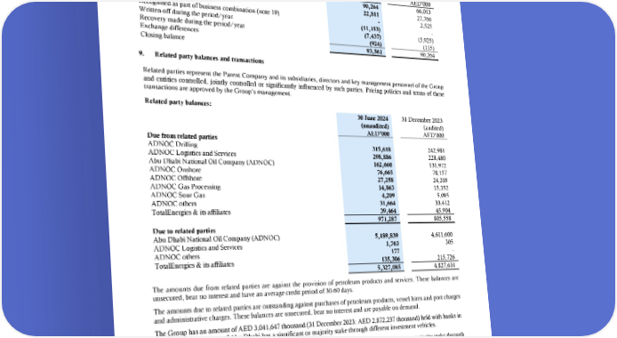 ABU DHABI NATIONAL OIL COMPANY FOR DISTRIBUTION PJSC Notes to the interim condensed consolidated financial statements for the six-month period ended 30 June 2024 (continued) 8. Trade receivables and other current assets (continued) Movement in the allowance for expected credit losses is as follows: 30 June 2024 31 December 2023 (unaudited) (audited) AED’000 AED’000 Opening balance 90,264 66,013 Charge for the period/year 22,811 27,766 Recognised as part of business combination (note 19) - 2,525 Written-off during the period/year (11,153) - Recovery made during the period/year (7,437) (5,925) Exchange differences (924) (115) Closing balance 93,561 90,264 9. Related party balances and transactions Related parties represent the Parent Company and its subsidiaries, directors and key management personnel of the Group and entities controlled, jointly controlled or significantly influenced by such parties. Pricing policies and terms of these transactions are approved by the Group’s management. Related party balances: 30 June 2024 31 December 2023 (unaudited) (audited) AED’000 AED’000 Due from related parties ADNOC Drilling 315,618 242,981 ADNOC Logistics and Services 298,886 228,480 Abu Dhabi National Oil Company (ADNOC) 162,660 131,972 ADNOC Onshore 76,665 78,157 ADNOC Offshore 27,258 24,205 ADNOC Gas Processing 14,863 15,352 ADNOC Sour Gas 4,209 5,095 ADNOC others 31,664 33,412 TotalEnergies & its affiliates 39,464 45,904 971,287 805,558 Due to related parties Abu Dhabi National Oil Company (ADNOC) 5,189,839 4,611,600 ADNOC Logistics and Services 1,763 305 ADNOC others 177 - TotalEnergies & its affiliates 135,306 215,726 5,327,085 4,827,631 The amounts due from related parties are against the provision of petroleum products and services. These balances are unsecured, bear no interest and have an average credit period of 30-60 days. The amounts due to related parties are outstanding against purchases of petroleum products, vessel hires and port charges and administrative charges. These balances are unsecured, bear no interest and are payable on demand. The Group has an amount of AED 3,041,647 thousand (31 December 2023: AED 2,872,237 thousand) held with banks in which the Government of Abu Dhabi has a significant or majority stake through different investment vehicles. The Group has a term loan from banks in which the Government of Abu Dhabi has a significant or majority stake through different investment vehicles amounting to AED 4,131,563 thousand (31 December 2023: AED 4,131,563 thousand). Amounts relating to TotalEnergies and its affiliates pertain to the related party balances and transactions of the Group’s newly acquired subsidiary, TotalEnergies Marketing Egypt LLC, during the period (note 19). In 2023, the Company entered into a sub-lease agreement with the Parent Company for a property located in Industrial City of Abu Dhabi for a term of 42 years commencing 1 January 2023. In this respect, the Company has recognised a right- of-use asset and a lease liability amounting to AED 210.7 million. In 2023, the Company entered into an amendment agreement to a lease for an office space with the Parent Company. 16