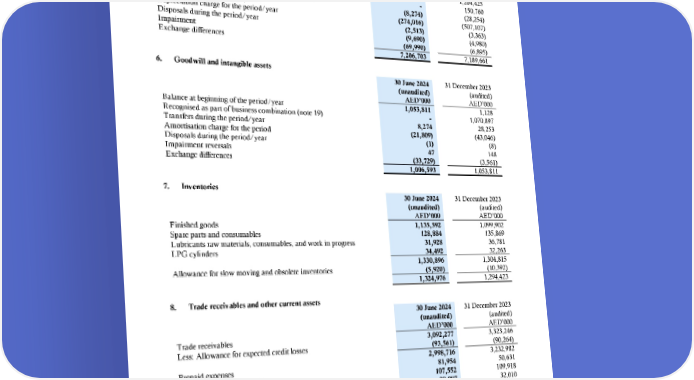 ABU DHABI NATIONAL OIL COMPANY FOR DISTRIBUTION PJSC Notes to the interim condensed consolidated financial statements for the six-month period ended 30 June 2024 (continued) 5. Property, plant, and equipment 30 June 2024 31 December 2023 (unaudited) (audited) AED’000 AED’000 Net book value at beginning of the period/year 7,189,661 6,385,075 Additions during the period/year 381,525 1,204,425 Recognised as part of business combination (note 19) - 150,760 Transfers during the period/year (8,274) (28,254) Depreciation charge for the period/year (274,016) (507,107) Disposals during the period/year (2,513) (3,363) Impairment (9,690) (4,980) Exchange differences (69,990) (6,895) 7,206,703 7,189,661 6. Goodwill and intangible assets 30 June 2024 31 December 2023 (unaudited) (audited) AED’000 AED’000 Balance at beginning of the period/year 1,053,811 1,128 Recognised as part of business combination (note 19) - 1,070,897 Transfers during the period/year 8,274 28,253 Amortisation charge for the period (21,809) (43,046) Disposals during the period/year (1) (8) Impairment reversals 47 148 Exchange differences (33,729) (3,561) 1,006,593 1,053,811 7. Inventories 30 June 2024 31 December 2023 (unaudited) (audited) AED’000 AED’000 Finished goods 1,135,592 1,099,902 Spare parts and consumables 128,884 135,869 Lubricants raw materials, consumables, and work in progress 31,928 36,781 LPG cylinders 34,492 32,263 1,330,896 1,304,815 Allowance for slow moving and obsolete inventories (5,920) (10,392) 1,324,976 1,294,423 8. Trade receivables and other current assets 30 June 2024 31 December 2023 (unaudited) (audited) AED’000 AED’000 Trade receivables 3,092,277 3,323,246 Less: Allowance for expected credit losses (93,561) (90,264) 2,998,716 3,232,982 Prepaid expenses 81,954 50,631 Receivable from employees 107,552 109,918 VAT receivables 29,987 32,010 Other receivables 88,957 93,872 3,307,166 3,519,413 15