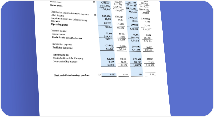 ABU DHABI NATIONAL OIL COMPANY FOR DISTRIBUTION PJSC Interim condensed consolidated statement of profit or loss for the six-month period ended 30 June 2024 3 months ended 30 June 6 months ended 30 June 2024 2023 2024 2023 Note AED’000 AED’000 AED’000 AED’000 Revenue 15 8,784,417 8,131,714 17,534,153 16,130,144 Direct costs (7,243,572) (6,743,736) (14,512,705) (13,478,276) Gross profit 1,540,845 1,387,978 3,021,448 2,651,868 Distribution and administrative expenses 16 (755,924) (737,388) (1,528,665) (1,406,162) Other income 26,028 29,287 70,633 77,942 Impairment losses and other operating (22,725) (14,240) (39,970) (32,160) expenses Operating profit 788,224 665,637 1,523,446 1,291,488 Interest income 32,496 16,428 80,434 31,604 Finance costs (113,203) (111,512) (322,366) (206,299) Profit for the period before tax 707,517 570,553 1,281,514 1,116,793 Income tax expense (73,842) (8,334) (120,144) (12,665) Profit for the period 633,675 562,219 1,161,370 1,104,128 Attributable to: Equity holders of the Company 622,840 551,488 1,172,480 1,088,809 Non-controlling interests 10,835 10,731 (11,110) 15,319 633,675 562,219 1,161,370 1,104,128 Basic and diluted earnings per share 17 0.050 0.044 0.094 0.087 The accompanying notes form an integral part of these interim condensed consolidated financial statements. 6