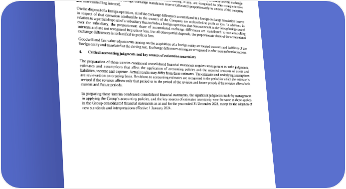 ABU DHABI NATIONAL OIL COMPANY FOR DISTRIBUTION PJSC Notes to the interim condensed consolidated financial statements for the six-month period ended 30 June 2024 (continued) 3. Material accounting policies (continued) 3.5 Foreign currencies (continued) For the purpose of presenting consolidated financial statements, the assets and liabilities of the Group’s foreign operations are translated at exchange rates prevailing on the reporting date. Income and expense items are translated at the average exchange rates for the period, unless exchange rates fluctuate significantly during that period, in which case the exchange rates at the date of transactions are used. Exchange differences arising, if any, are recognised in other comprehensive income and accumulated in a foreign exchange translation reserve (allocated proportionately to owners of the company and non-controlling interest). On the disposal of a foreign operation, all of the exchange differences accumulated in a foreign exchange translation reserve in respect of that operation attributable to the owners of the Company are reclassified to profit or loss. In addition, in relation to a partial disposal of a subsidiary that includes a foreign operation that does not result in the Group losing control over the subsidiary, the proportionate share of accumulated exchange differences are reattributed to non-controlling interests and are not recognised in profit or loss. For all other partial disposals, the proportionate share of the accumulated exchange differences is reclassified to profit or loss. Goodwill and fair value adjustments arising on the acquisition of a foreign entity are treated as assets and liabilities of the foreign entity and translated at the closing rate. Exchange differences arising are recognised in other comprehensive income. 4. Critical accounting judgments and key sources of estimation uncertainty The preparation of these interim condensed consolidated financial statements requires management to make judgments, estimates and assumptions that affect the application of accounting policies and the reported amounts of assets and liabilities, income and expense. Actual results may differ from these estimates. The estimates and underlying assumptions are reviewed on an ongoing basis. Revisions to accounting estimates are recognised in the period in which the estimate is revised if the revision affects only that period or in the period of the revision and future periods if the revision affects both current and future periods. In preparing these interim condensed consolidated financial statements, the significant judgments made by management in applying the Group’s accounting policies, and the key sources of estimates uncertainty were the same as those applied in the Group consolidated financial statements as at and for the year ended 31 December 2023, except for the adoption of new standards and interpretations effective 1 January 2024. 14