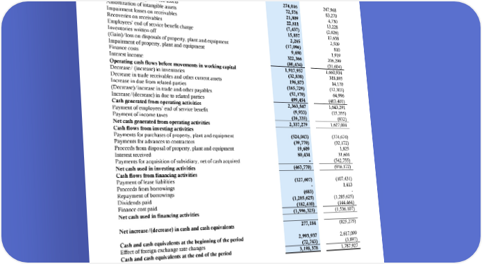 ABU DHABI NATIONAL OIL COMPANY FOR DISTRIBUTION PJSC Interim condensed consolidated statement of cash flow for the six-month period ended 30 June 2024 6 months ended 30 June 2024 30 June 2023 AED’000 AED’000 Cash flows from operating activities Profit for the period before tax 1,281,514 1,116,793 Adjustments for: Depreciation of property, plant and equipment 274,016 247,968 Depreciation of right-of-use assets 72,576 83,270 Amortization of intangible assets 21,809 4,730 Impairment losses on receivables 22,811 13,228 Recoveries on receivables (7,437) (2,626) Employees’ end of service benefit charge 15,857 17,638 Inventories written off 2,285 2,509 (Gain)/loss on disposals of property, plant and equipment (17,096) 810 Impairment of property, plant and equipment 9,690 1,919 Finance costs 322,366 206,299 Interest income (80,434) (31,604) Operating cash flows before movements in working capital 1,917,957 1,660,934 Decrease/ (increase) in inventories (32,838) 318,895 Decrease in trade receivables and other current assets 196,873 14,170 Increase in due from related parties (165,729) (12,303) (Decrease)/increase in trade and other payables (52,170) 64,996 Increase/(decrease) in due to related parties 499,454 (403,401) Cash generated from operating activities 2,363,547 1,643,291 Payment of employees’ end of service benefit (9,933) (15,355) Payment of income taxes (16,335) (932) Net cash generated from operating activities 2,337,279 1,627,004 Cash flows from investing activities Payments for purchases of property, plant and equipment (524,043) (374,674) Payments for advances to contractors (39,770) (32,172) Proceeds from disposal of property, plant and equipment 19,609 1,825 Interest received 80,434 31,604 Payments for acquisition of subsidiary, net of cash acquired - (542,755) Net cash used in investing activities (463,770) (916,172) Cash flows from financing activities Payment of lease liabilities (127,607) (107,431) Proceeds from borrowings - 1,413 Repayment of borrowings (683) - Dividends paid (1,285,625) (1,285,625) Finance cost paid (182,410) (144,464) Net cash used in financing activities (1,596,325) (1,536,107) Net increase/(decrease) in cash and cash equivalents 277,184 (825,275) Cash and cash equivalents at the beginning of the period 2,993,937 2,617,099 Effect of foreign exchange rate changes (72,743) (3,897) Cash and cash equivalents at the end of the period 3,198,378 1,787,927 Non-cash transactions Accruals for property, plant and equipment 454,237 425,631 Advances to contractors transferred to property, plant and equipment 13,362 23,091 Additions to right of use assets for land leases 125,780 382,401 The accompanying notes form an integral part of these interim condensed consolidated financial statements. 9