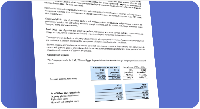 ABU DHABI NATIONAL OIL COMPANY FOR DISTRIBUTION PJSC Notes to the interim condensed consolidated financial statements for the six-month period ended 30 June 2024 (continued) 18. Segment reporting Operating segments The Group’s operating segments are established on the basis of those components that are evaluated regularly by the Board of Directors, considered to be the Chief Operating Decision Maker (“CODM”). The CODM monitors the operating results of the Group’s operating segments separately for the purpose of making decisions about resource allocation and performance assessment. Segment performance is evaluated based on revenues, gross profit, net profit and a broad range of key performance indicators in addition to segment profitability and is measured consistently with profit or loss in the interim condensed consolidated financial statements. Based on the information reported to the Group’s senior management for the allocation of resources, marketing strategies, management reporting lines and measurement of performance of business, the reportable segments under IFRS 8 were identified as below: Commercial (B2B) - sale of petroleum products and ancillary products to commercial and government customers, the provision of aviation fuel and fuelling services to strategic customers, and the provision of fuelling services to the Parent Company’s civil aviation customers. Retail (B2C) - sale of gasoline and petroleum products, convenience store sales, car wash and other car care services, oil change services, vehicle inspection services and property leasing and management through the retail sites. These segments are the basis on which the Group reports its primary segment information. Transactions between segments are conducted at the rates determined by management taking into consideration the cost of funds. Segment revenue reported represents revenue generated from external customers. There were no inter-segment sales in current and previous period. Operating profit is the measure reported to the Board of Directors for the purpose of resource allocation and assessment of segment performance. Geographical segments The Group operates in the UAE, KSA and Egypt. Segment information about the Group’s foreign operations is presented below: 6 months ended 30 June 2024 6 months ended 30 June 2023 KSA Egypt KSA Egypt (unaudited) (unaudited) (unaudited) (unaudited) AED’000 AED’000 AED’000 AED’000 Revenue (external customers) 439,368 1,759,108 367,030 1,481,217 KSA Egypt AED’000 AED’000 As at 30 June 2024 (unaudited) Property, plant and equipment 267,955 133,670 Right of use assets 631,056 45,116 Goodwill and intangible assets 1,129 1,005,464 20