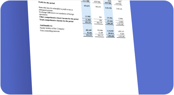 ABU DHABI NATIONAL OIL COMPANY FOR DISTRIBUTION PJSC Interim condensed consolidated statement of comprehensive income for the six-month period ended 30 June 2024 3 months ended 30 June 6 months ended 30 June 2024 2023 2024 2023 AED’000 AED’000 AED’000 AED’000 Profit for the period 633,675 562,219 1,161,370 1,104,128 Items that may be reclassified to profit or loss in subsequent periods Exchange differences on translation of foreign (1,342) 956 (75,102) (2,868) operations Other comprehensive (loss)/income for the period (1,342) 956 (75,102) (2,868) Total comprehensive income for the period 632,333 563,175 1,086,268 1,101,260 Attributable to: Equity holders of the Company 622,169 551,966 1,134,929 1,087,375 Non-controlling interests 10,164 11,209 (48,661) 13,885 632,333 563,175 1,086,268 1,101,260 The accompanying notes form an integral part of these interim condensed consolidated financial statements. 7