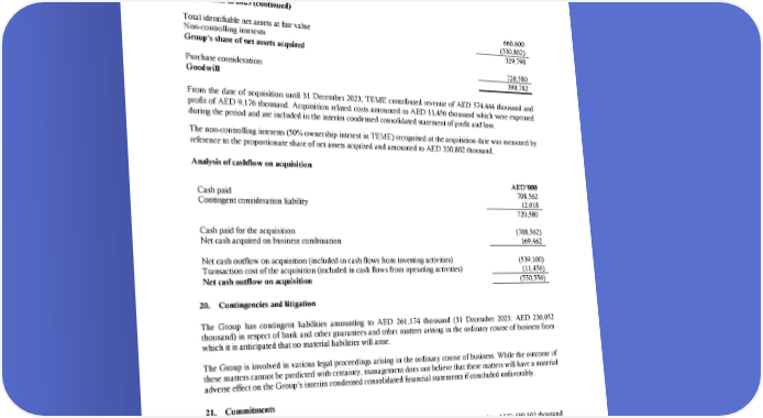 ABU DHABI NATIONAL OIL COMPANY FOR DISTRIBUTION PJSC Notes to the interim condensed consolidated financial statements for the three-month period ended 31 March 2024 (continued) 19. Business Combination (continued) 19.1 TotalEnergies Marketing Egypt LLC (continued) Acquisitions in 2023 (continued) Total identifiable net assets at fair value 660,600 Non-controlling interests (330,802) Group’s share of net assets acquired 329,798 Purchase consideration 720,580 Goodwill 390,782 From the date of acquisition until 31 December 2023, TEME contributed revenue of AED 574,444 thousand and profit of AED 9,176 thousand. Acquisition related costs amounted to AED 11,456 thousand which were expensed during the period and are included in the interim condensed consolidated statement of profit and loss. The non-controlling interests (50% ownership interest in TEME) recognised at the acquisition date was measured by reference to the proportionate share of net assets acquired and amounted to AED 330,802 thousand. Analysis of cashflow on acquisition AED’000 Cash paid 708,562 Contingent consideration liability 12,018 720,580 Cash paid for the acquisition (708,562) Net cash acquired on business combination 169,462 Net cash outflow on acquisition (included in cash flows from investing activities) (539,100) Transaction cost of the acquisition (included in cash flows from operating activities) (11,456) Net cash outflow on acquisition (550,556) 20. Contingencies and litigation The Group has contingent liabilities amounting to AED 261,174 thousand (31 December 2023: AED 230,052 thousand) in respect of bank and other guarantees and other matters arising in the ordinary course of business from which it is anticipated that no material liabilities will arise. The Group is involved in various legal proceedings arising in the ordinary course of business. While the outcome of these matters cannot be predicted with certainty, management does not believe that these matters will have a material adverse effect on the Group’s interim condensed consolidated financial statements if concluded unfavorably. 21. Commitments The capital expenditure contracted for at the reporting date but not yet incurred amounted to AED 450,302 thousand (31 December 2023: AED 368,216 thousand). 22. Seasonality of results There is no material impact of seasonality on the Group’s operating results. 24