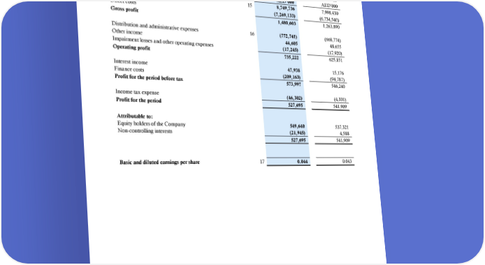 ABU DHABI NATIONAL OIL COMPANY FOR DISTRIBUTION PJSC Interim condensed consolidated statement of profit or loss For the three-month period ended 31 March 2024 3 months ended 31 March 2024 31 March 2023 Note AED’000 AED’000 Revenue 15 8,749,736 7,998,430 Direct costs (7,269,133) (6,734,540) Gross profit 1,480,603 1,263,890 Distribution and administrative expenses 16 (772,741) (668,774) Other income 44,605 48,655 Impairment losses and other operating expenses (17,245) (17,920) Operating profit 735,222 625,851 Interest income 47,938 15,176 Finance costs (209,163) (94,787) Profit for the period before tax 573,997 546,240 Income tax expense (46,302) (4,331) Profit for the period 527,695 541,909 Attributable to: Equity holders of the Company 549,640 537,321 Non-controlling interests (21,945) 4,588 527,695 541,909 Basic and diluted earnings per share 17 0.044 0.043 The accompanying notes form an integral part of these interim condensed consolidated financial statements. 6