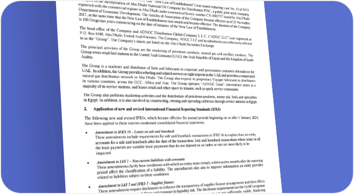 ABU DHABI NATIONAL OIL COMPANY FOR DISTRIBUTION PJSC Notes to the interim condensed consolidated financial statements for the three-month period ended 31 March 2024 1. General information Abu Dhabi National Oil Company for Distribution PJSC (“ADNOC Distribution” or the “Company”), formerly Abu Dhabi National Oil Company for Distribution, is a company incorporated by Law No. 13 of 1973 issued by His Highness the Acting Ruler of the Emirate of Abu Dhabi. On 22 November 2017, Law No. 15 of 2017 (the “New Law of Establishment”) was issued replacing Law No. 13 of 1973 in respect of the incorporation of Abu Dhabi National Oil Company for Distribution PJSC, a public joint stock company registered with the commercial register in Abu Dhabi under commercial licence number CN-1002757 issued by Abu Dhabi Department of Economic Development. The Articles of Association of the Company became effective as of 22 November 2017, at the same time that the New Law of Establishment was issued and became effective. The duration of the Company is 100 Gregorian years commencing on the date of issuance of the New Law of Establishment. The head office of the Company and ADNOC Distribution Global Company L.L.C. (“ADGC LLC”) are registered at P.O. Box 4188, Abu Dhabi, United Arab Emirates. The Company, ADGC LLC and its subsidiaries are collectively referred to as the “Group”. The Company’s shares are listed on the Abu Dhabi Securities Exchange. The principal activities of the Group are the marketing of petroleum products, natural gas and ancillary products. The Group owns retail fuel stations in the United Arab Emirates (UAE), the Arab Republic of Egypt and the Kingdom of Saudi Arabia. The Group is a marketer and distributor of fuels and lubricants to corporate and government customers throughout the UAE. In addition, the Group provides refueling and related services at eight airports in the UAE and provides a compressed natural gas distribution network in Abu Dhabi. The Group also exports its proprietary Voyager lubricants to distributors in various countries, across the GCC, Africa and Asia. The Group operates “ADNOC Oasis” convenience stores at a majority of its service stations, and leases retail and other space to tenants, such as quick service restaurants. The Group also performs marketing activities and the distribution of petroleum products, motor oils, fuels and specialties in Egypt. In addition, it is also involved in constructing, owning and operating cafeterias through service stations in Egypt. 2. Application of new and revised International Financial Reporting Standards (IFRS) The following new and revised IFRSs, which became effective for annual periods beginning on or after 1 January 2024, have been applied in these interim condensed consolidated financial statements: • Amendment to IFRS 16 – Leases on sale and leaseback These amendments include requirements for sale and leaseback transactions in IFRS 16 to explain how an entity accounts for a sale and leaseback after the date of the transaction. Sale and leaseback transactions where some or all the lease payments are variable lease payments that do not depend on an index or rate are most likely to be impacted. • Amendment to IAS 1 – Non-current liabilities with covenants These amendments clarify how conditions with which an entity must comply within twelve months after the reporting period affect the classification of a liability. The amendments also aim to improve information an entity provides related to liabilities subject to these conditions. • Amendment to IAS 7 and IFRS 7 - Supplier finance These amendments require disclosures to enhance the transparency of supplier finance arrangements and their effects on an entity’s liabilities, cash flows and exposure to liquidity risk. The disclosure requirements are the IASB’s response to investors’ concerns that some companies’ supplier finance arrangements are not sufficiently visible, hindering investors’ analysis. 10