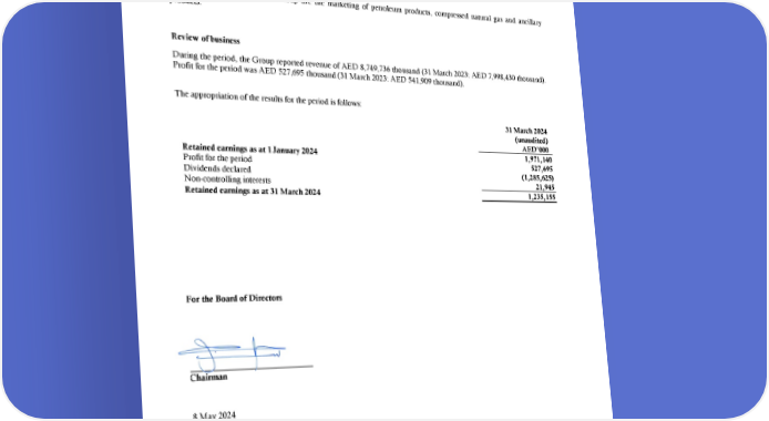 ABU DHABI NATIONAL OIL COMPANY FOR DISTRIBUTION PJSC Directors’ report for the three-month period ended 31 March 2024 The Directors present their report together with the interim financial information of Abu Dhabi National Oil Company for Distribution PJSC (the “Company”) and its subsidiaries (collectively referred to as “the Group”) for the three-month period ended 31 March 2024. Principal activities The principal activities of the Group are the marketing of petroleum products, compressed natural gas and ancillary products. Review of business During the period, the Group reported revenue of AED 8,749,736 thousand (31 March 2023: AED 7,998,430 thousand). Profit for the period was AED 527,695 thousand (31 March 2023: AED 541,909 thousand). The appropriation of the results for the period is follows: 31 March 2024 (unaudited) AED’000 Retained earnings as at 1 January 2024 1,971,140 Profit for the period 527,695 Dividends declared (1,285,625) Non-controlling interests 21,945 Retained earnings as at 31 March 2024 1,235,155 For the Board of Directors Chairman 8 May 2024 Abu Dhabi, UAE 3
