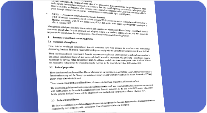 ABU DHABI NATIONAL OIL COMPANY FOR DISTRIBUTION PJSC Notes to the interim condensed consolidated financial statements for the three-month period ended 31 March 2024 (continued) 2. Application of new and revised International Financial Reporting Standards (IFRS) (continued) The application of these revised IFRSs has not had any material impact on the amounts reported for the current and prior years but may affect the accounting for future transactions or arrangements. New and amended IFRS Standards in issue but not yet effective and not early adopted • Amendments to IAS 21 - Lack of Exchangeability An entity is impacted by the amendments when it has a transaction or an operation in a foreign currency that is not exchangeable into another currency at a measurement date for a specified purpose. A currency is exchangeable when there is an ability to obtain the other currency (with a normal administrative delay), and the transaction would take place through a market or exchange mechanism that creates enforceable rights and obligations. • IFRS 18 — Presentation and Disclosure in Financial Statements IFRS 18 includes requirements for all entities applying IFRS for the presentation and disclosure of information in financial statements. IFRS 18 was issued in April 2024 and applies to an annual reporting period beginning on or after 1 January 2027. Management anticipates that these new standards and amendments will be adopted in the Group’s consolidated financial statements as and when they are applicable and adoption of these new standards and amendments, may have no material impact on the consolidated financial statements of the Group in the period of initial application. 3. Summary of significant accounting policies 3.1 Statement of compliance These interim condensed consolidated financial statements have been prepared in accordance with International Accounting Standard 34 Interim Financial Reporting and comply with the applicable requirements of the laws in the UAE. These interim condensed consolidated financial statements do not include all the information and disclosures required in the annual consolidated financial statements and should be read in conjunction with the Group’s consolidated financial statements for the year ended 31 December 2023. In addition, results for the three-month period ended 31 March 2024 are not necessarily indicative of the results that may be expected for the financial year ending 31 December 2024. 3.2 Basis of preparation These interim condensed consolidated financial statements are presented in UAE Dirhams (AED), which is the Company’s functional currency and the Group’s presentation currency, and all values are rounded to the nearest thousands (AED’000) except when otherwise indicated. These interim condensed consolidated financial statements have been prepared on a historical cost basis. The accounting policies used in the preparation of these interim condensed consolidated financial statements are consistent with those applied to the audited annual consolidated financial statements for the year ended 31 December 2023, except for the policies disclosed below and the adoption of new standards and interpretations effective 1 January 2024. 3.3 Basis of Consolidation The interim condensed consolidated financial statements incorporate the financial statements of the Company and entities controlled by the Company and its subsidiaries. Control is achieved when the Company: • Has power over the investee • Is exposed, or has rights, to variable returns from its involvement • Has the ability to use its power to affect its returns The Company reassesses whether or not it controls an investee if facts and circumstances indicate that there are changes to one or more of the three elements of control listed above. 11