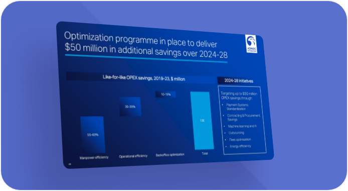 Optimization programme in place to deliver $50 million in additional savings over 2024-28 Like-for-like OPEX savings, 2019-23, $ million 2024-28 initiatives 10-15% Targeting up to $50 million OPEX savings through: 30-35% • Payment Systems Standardization • Contracting & Procurement 130 Savings • Machine learning and AI 55-60% • Outsourcing • Fleet optimization • Energy efficiency Manpower efficiency Operational efficiency Backoffice optimization Total 44