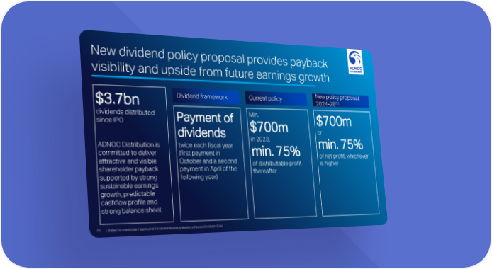 New dividend policy proposal provides payback visibility and upside from future earnings growth Dividend framework Current policy New policy proposal: (1) $3.7bn 2024-28 dividends distributed Payment of Min. $700m since IPO dividends $700m or ADNOC Distribution is twice each fiscal year in 2023, min. 75% committed to deliver (first payment in min. 75% of net profit, whichever attractive and visible October and a second of distributable profit is higher shareholder payback payment in April of the thereafter supported by strong following year) sustainable earnings growth, predictable cashflow profile and strong balance sheet 11 1. Subject to shareholders’ approval at the General Assembly Meeting scheduled for March 2024