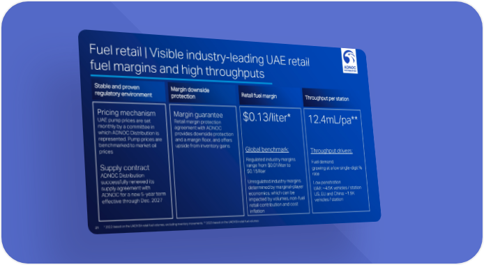 Fuel retail | Visible industry-leading UAE retail fuel margins and high throughputs Stable and proven Margin downside Retail fuel margin Throughput per station regulatory environment protection Pricing mechanism Margin guarantee $0.13/liter* 12.4mL/pa** UAE pump prices are set Retail margin protection monthly by a committee in agreement with ADNOC which ADNOC Distribution is provides downside protection represented. Pump prices are and a margin floor, and offers benchmarked to market oil upside from inventory gains Global benchmark: Throughput drivers: prices Regulated industry margins Fuel demand Supply contract range from $0.01/liter to growing at a low single-digit % ADNOC Distribution $0.15/liter rate successfully renewed its Unregulated industry margins Low penetration supply agreement with determined by marginal-player UAE: ~4.5K vehicles / station ADNOC for a new 5-year term economics, which can be US, EU and China: ~1.9K effective through Dec. 2027 impacted by volumes, non-fuel vehicles / station retail contribution and cost inflation 21 * 2022: based on the UAE/KSA retail fuel volumes, excluding inventory movements. ** 2023: based on the UAE/KSA retail fuel volumes