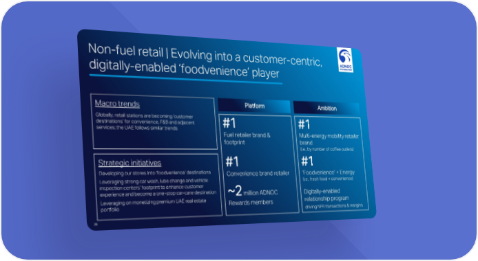 Non-fuel retail | Evolving into a customer-centric, digitally-enabled ‘foodvenience’ player Macro trends Platform Ambition Globally, retail stations are becoming ‘customer destinations’ for convenience, F&B and adjacent #1 #1 services; the UAE follows similar trends Fuel retailer brand & Multi-energy mobility retailer footprint brand (i.e., by number of coffee outlets) Strategic initiatives #1 #1 Developing our stores into ‘foodvenience’ destinations Convenience brand retailer ‘Foodvenience’ + Energy Leveraging strong car wash, lube change and vehicle (i.e., fresh food + convenience) inspection centers’ footprint to enhance customer experience and become a one-stop car-care destination ~2 million ADNOC Digitally-enabled Leveraging on monetizing premium UAE real estate Rewards members relationship program portfolio driving NFR transactions & margins 25