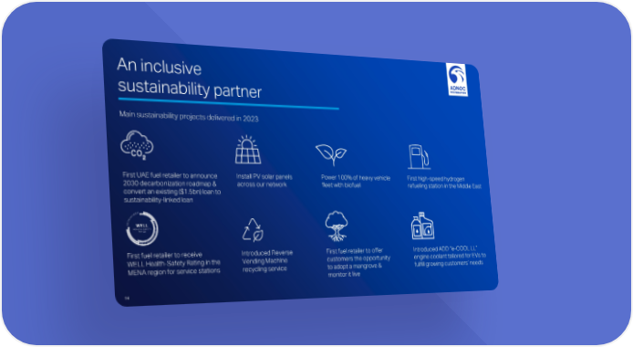An inclusive sustainability partner Main sustainability projects delivered in 2023 First UAE fuel retailer to announce Install PV solar panels Power 100% of heavy vehicle First high-speedhydrogen 2030 decarbonization roadmap & across our network fleet with biofuel refueling station in the Middle East convert an existing ($1.5bn) loan to sustainability-linked loan First fuel retailer to receive IntroducedReverse First fuel retailer to offer Introduced ADD “e-COOL LL” WELL Health-Safety Rating in the Vending Machine customers the opportunity engine coolant tailored for EVs to MENA region for service stations recycling service to adopt a mangrove & fulfill growing customers’ needs monitor it live 14