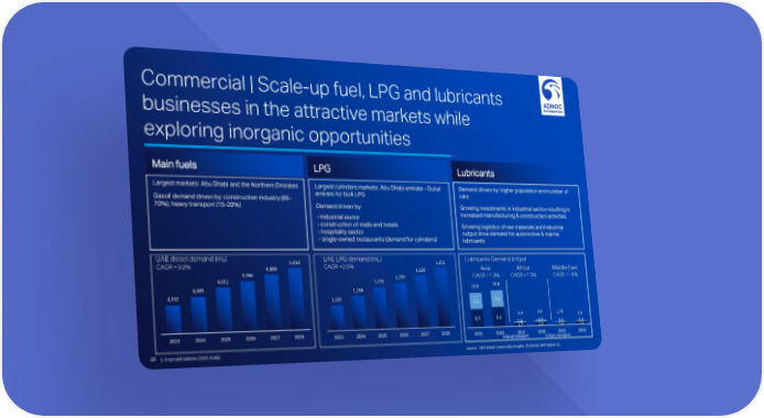 Commercial | Scale-up fuel, LPG and lubricants businesses in the attractive markets while exploring inorganic opportunities Main fuels LPG Lubricants Largest markets: Abu Dhabi and the Northern Emirates Largest cylinders markets: Abu Dhabi emirate - Dubai Demand driven by: higher population and number of Gasoil demand driven by: construction industry (65- emirate for bulk LPG cars 70%), heavy transport (15-20%) Demand driven by: Growing investments in industrial sector resulting in - industrial sector increased manufacturing & construction activities - construction of malls and hotels Growing logistics of raw materials and industrial - hospitality sector output drive demand for automotive & marine - single-owned restaurants (demand for cylinders) lubricants UAE diesel demand (mL) 5,010 UAE LPG demand (mL) 1,251 Lubricants Demand (mtpa) CAGR +3.0% 4,888 CAGR +2.5% 1,220 Asia Africa Middle East 4,768 1,190 CAGR +1.3% CAGR +1.3% CAGR +1.8% 4,651 1,173 4,483 1,138 15.8 16.8 4,332 1,102 7.3 7.6 2.3 2.6 1.76 1.9 8.5 9.2 0.6 0.7 0.4 1.7 1.9 0.4 2023 2024 2025 2026 2027 2028 1.4 1.5 2023 2024 2025 2026 2027 2028 2022 2028 2022 2028 2022 2028 Inland transport Inland trasport Non-transport 22 1. Frost and Sullivan (2021 study) Source: S&P Global Commodity Insights, ©2024 by S&P Global Inc.