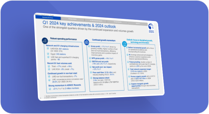 ADNOC Classification: Public Executive Summary Strategy Update Q1 2024 Financial Results Closing Remarks Appendix Q1 2024 key achievements & 2024 outlook One of the strongest quarters driven by the continued expansion and volumes growth Robust operating performance Continued growth momentum Outlook: focus on disciplined growth, technology and innovation Network and EV charging infrastructure Gross profit: +17% Y-o-Y, driven by Deliver incremental growth with a focus UAE/KSA: 601 stations growing mobility, higher number of fuel on operational excellence and (Q1 2023: 574) and non-fuel transactions, efficiency futureproofing the business improvements and a positive impact of AI: leverage advanced technologies to Egypt: 245 stations inventory gains enhance customer experience and UAE fast and superfast EV charging NFR gross profit: +16% Y-o-Y improve operational efficiency points: ~90 EBITDA and net profit: Future proofing: double number of Record Q1 fuel volumes sold +18% and +2% Y-o-Y, respectively profitable fast and super-fast EV charging Total: +17% (retail: +18%) Net profit excl. tax impact: points to c.200 by the end of 2024 UAE/KSA: +9% (retail: +7%) +13% Y-o-Y Total network expansion target: Continued growth in non-fuel retail Free cash flow: $158 million and 15-20 new stations in 2024 industry-leading ROCE: 29.5% (8 added in Q1 2024) UAE non-fuel transactions: +7% Pursue organic growth with a CAPEX 1 Strong balance sheet: UAE convenience store conversion rate 0.50x net debt / EBITDA plan of $250-300 million in 2024 24.5% (Q1 2023: 24.4%) 2 (2023: $320 million) based on $1.04 billion LTM EBITDA Strong momentum in ADNOC Rewards (2023: 0.62x) Explore inorganic growth +21% Y-o-Y to 2 million members opportunities through value-accretive transactions 1. Number of convenience stores transactions divided by number of fuel transactions at sites with convenience stores. 2. LTM – last 12 months 6 © ADNOC Distribution