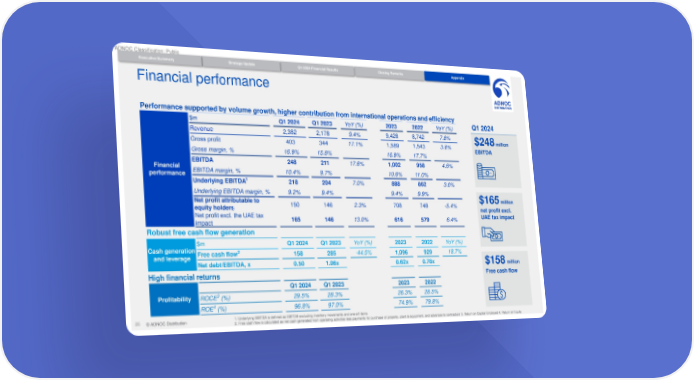ADNOC Classification: Public Strategy Update Q1 2024 Financial Results Closing Remarks Appendix Executive Summary Q1 2024 Financial Results Financial performance Performance supported by volume growth, higher contribution from international operations and efficiency $m Q1 2024 Q1 2023 YoY (%) 2023 2022 YoY (%) Q1 2024 Revenue 2,382 2,178 9.4% 9,428 8,742 7.8% $248 million Gross profit 403 344 17.1% 1,589 1,543 3.0% EBITDA Gross margin, % 16.9% 15.8% 16.9% 17.7% Financial EBITDA 248 211 17.6% 1,002 958 4.6% performance EBITDA margin, % 10.4% 9.7% 10.6% 11.0% 1 Underlying EBITDA 218 204 7.0% 888 862 3.0% Underlying EBITDA margin, % 9.2% 9.4% 9.4% 9.9% $165 million Net profit attributable to 150 146 2.3% 708 748 -5.4% equity holders net profit excl. Net profit excl. the UAE tax 165 146 13.0% 616 579 6.4% UAE tax impact impact Robust free cash flow generation $m Q1 2024 Q1 2023 YoY (%) 2023 2022 YoY (%) Cash generation Free cash flow2 158 285 -44.5% 1,096 929 18.7% and leverage Net debt/EBITDA, x 0.50 1.06x 0.62x 0.78x $158 million High financial returns Free cash flow Q1 2024 Q1 2023 2023 2022 3 Profitability ROCE (%) 29.5% 28.3% 26.3% 28.5% 4 ROE (%) 96.8% 97.0% 74.9% 79.8% 26 © ADNOC Distribution 1. Underlying EBITDA is defined as EBITDA excluding inventory movements and one-off items 2. Free cash flow is calculated as net cash generated from operating activities less payments for purchase of property, plant & equipment, and advances to contractors 3. Return on Capital Employed 4. Return on Equity