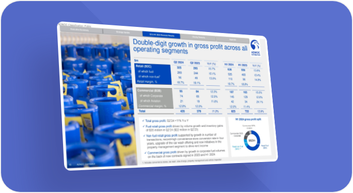 ADNOC Classification: Public Executive Summary Strategy Update Q2 & H1 2024 Financial Results Closing Remarks Appendix Double-digit growth in gross profit across all operating segments $m Q2 2024 Q2 2023 YoY (%) H1 2024 H1 2023 YoY (%) Retail (B2C) 325 293 10.7% 636 559 13.6% of which fuel 269 244 10.1% 525 463 13.4% of which non-fuel1 56 49 13.5% 110 96 14.8% Retail margin, % 19.7% 19.1% 19.7% 18.8% Commercial (B2B) 95 84 12.3% 187 163 15.0% of which Corporate 74 65 12.5% 145 129 12.6% of which Aviation 21 19 11.6% 42 34 24.1% Commercial margin, % 12.8% 12.5% 12.0% 11.4% Total 420 378 11.0% 823 722 13.9% ✓Total gross profit: Q2’24 +11% Y-o-Y H1 2024 gross profit split ✓Fuel retail gross profit driven by volume growth and inventory gains Commercial (B2B) - Aviation of $35 million in Q2’24 ($22 million in Q2’23) ✓Non-fuel retail gross profit supported by growth in number of Commercial (B2B) 5% transactions, record-high convenience store conversion rate in four - Corporate 18% years, upgrade of the car wash offering and new initiatives in the $823m property management segment to drive rent income 14% 64% Retail non-Fuel Retail Fuel ✓Commercial gross profit driven by growth in corporate fuel volumes (B2C) (1) (B2C) on the back of new contracts signed in 2023 and H1 2024 18 ADNOC Distribution © ADNOC Distribution 1. Includes convenience stores, car wash, lube change, property management and vehicle inspection
