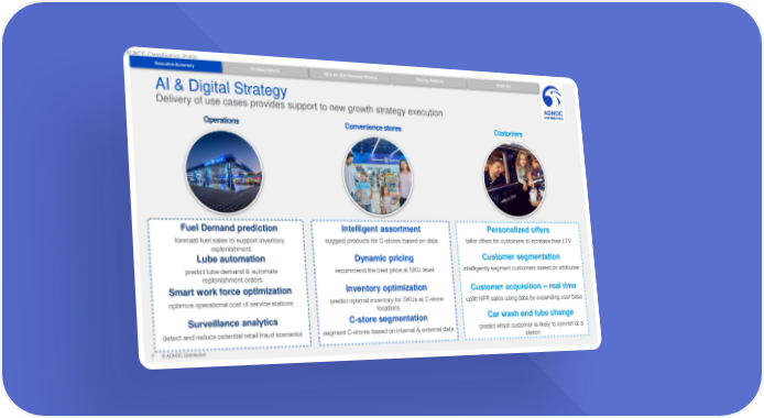 ADNOC Classification: Public Executive Summary Strategy Update Q2 & H1 2024 Financial Results Closing Remarks Appendix AI & Digital Strategy Delivery of use cases provides support to new growth strategy execution Operations Convenience stores Customers Fuel Demand prediction Intelligent assortment Personalized offers forecast fuel sales to support inventory suggest products for C-stores based on data tailor offers for customers to increase their LTV replenishment Lube automation Dynamic pricing Customer segmentation predict lube demand & automate recommend the best price at SKU level intelligently segment customers based on attributes replenishment orders Smart work force optimization Inventory optimization Customer acquisition – real time optimize operational cost of service stations predict optimal inventory for SKUs at C-store uplift NFR sales using data by expanding user base locations Surveillance analytics C-store segmentation Car wash and lube change detect and reduce potential retail fraud scenarios segment C-stores based on internal & external data predict which customer is likely to convert at a station 7 © ADNOC Distribution