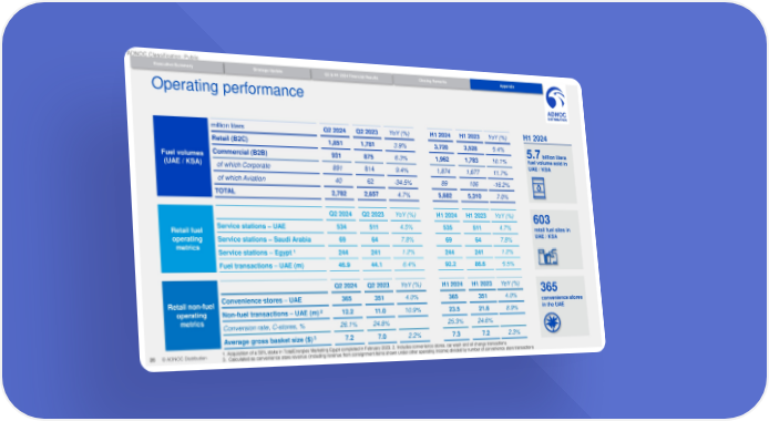 ADNOC Classification: Public Strategy Update Q2 & H1 2024 Financial Results Closing Remarks Appendix Executive Summary Q1 2024 Financial Results Operating performance million liters Q2 2024 Q2 2023 YoY (%) H1 2024 H1 2023 YoY (%) H1 2024 Retail (B2C) 1,851 1,781 3.9% 3,720 3,528 5.4% 5.7 billion liters Fuel volumes Commercial (B2B) 931 875 6.3% 1,962 1,783 10.1% fuel volume sold in (UAE / KSA) of which Corporate 891 814 9.4% 1,874 1,677 11.7% UAE / KSA of which Aviation 40 62 -34.5% 89 106 -16.2% TOTAL 2,782 2,657 4.7% 5,682 5,310 7.0% Q2 2024 Q2 2023 YoY (%) H1 2024 H1 2023 YoY (%) 603 Retail fuel Service stations – UAE 534 511 4.5% 535 511 4.7% retail fuel sites in operating Service stations – Saudi Arabia 69 64 7.8% 69 64 7.8% UAE / KSA metrics Service stations – Egypt 1 244 241 1.2% 244 241 1.2% Fuel transactions – UAE (m) 46.9 44.1 6.4% 92.2 86.6 6.5% Q2 2024 Q2 2023 YoY (%) H1 2024 H1 2023 YoY (%) 365 Retail non-fuel Convenience stores – UAE 365 351 4.0% 365 351 4.0% convenience stores operating 2 12.2 11.0 10.9% 23.5 21.6 8.9% in the UAE Non-fuel transactions – UAE (m) metrics Conversion rate, C-stores, % 26.1% 24.8% 25.3% 24.6% Average gross basket size ($) 3 7.2 7.0 2.2% 7.3 7.2 2.3% 26 © ADNOC Distribution 1. Acquisition of a 50% stake in TotalEnergies Marketing Egypt completed in February 2023. 2. Includes convenience stores, car wash and oil change transactions 3. Calculated as convenience store revenue (including revenue from consignment items shown under other operating income) divided by number of convenience store transactions