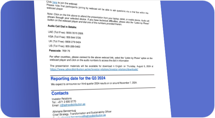 ADNOC Classification: Public H1 2024 earnings conference call details A conference call in English for investors and analysts will be held on Thursday, August 8, 2024, at 4 p.m. UAE / 1 p.m. London / 8 a.m. New York. To access the management presentation, followed by a Q&A session, please connect through one of the following methods: Webcast Click here to join the webcast Please note that participants joining by webcast will be able to ask questions via a chat box within the webcast player Note: Click on the link above to attend the presentation from your laptop, tablet, or mobile device. Audio will stream through your selected device. If you have technical difficulties, please click the “Listen by Phone” button on the webcast player and dial one of the numbers provided therein. Audio Call Dial in Details: UAE (Toll Free): 8000 3570 2606 KSA (Toll Free): 800 844 5726 UK (Toll Free): 0800 279 0424 US (Toll Free): 800-289-0462 Passcode: 769179 For other countries, please connect to the above webcast link, select the “Listen by Phone” option on the webcast player and click on the audio numbers to access the dial in information The presentation materials will be available for download in English on Thursday, August 8, 2024 at https://www.adnocdistribution.ae/en/investor-relations/investor-relations/downloads/ Reporting date for the Q3 2024 We expect to announce our third quarter 2024 results on or around November 7, 2024. Contacts Investor Relations Tel.: +971 2 695 9770 Email: ir@adnocdistribution.ae Athmane Benzerroug Chief Strategy, Transformation and Sustainability Officer Email: athmane.benzerroug@adnocdistribution.ae August 8, 2024 ABU DHABI NATIONAL OIL COMPANY FOR DISTRIBUTION PJSC 23 | P a g e