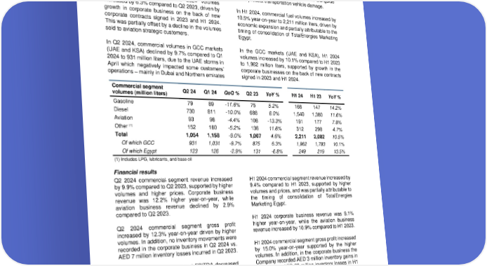 ADNOC Classification: Public Commercial segment – B2B (corporate and aviation) Volumes In Q2 2024, commercial fuel volumes increased by – where the storm was more intense, alongside 4.6% year-on-yearn to 1,054 million liters. In GCC some product transportation vehicle damage. markets (UAE and KSA), Q2 2024 volumes increased by 6.3% compared to Q2 2023, driven by In H1 2024, commercial fuel volumes increased by growth in corporate business on the back of new 10.5% year-on-year to 2,211 million liters, driven by corporate contracts signed in 2023 and H1 2024. economic expansion and partially attributable to the This was partially offset by a decline in the volumes timing of consolidation of TotalEnergies Marketing sold to aviation strategic customers. Egypt. In Q2 2024, commercial volumes in GCC markets In the GCC markets (UAE and KSA), H1 2024 (UAE and KSA) declined by 9.7% compared to Q1 volumes increased by 10.1% compared to H1 2023 2024 to 931 million liters , due to the UAE storms in to 1,962 million liters, supported by growth in the April which negatively impacted some customers’ corporate businesses on the back of new contracts operations – mainly in Dubai and Northern emirates signed in 2023 and H1 2024. Commercial segment Q2 24 Q1 24 QoQ % Q2 23 YoY % H1 24 H1 23 YoY % volumes (million liters) Gasoline 79 89 -11.6% 75 5.2% 168 147 14.2% Diesel 730 811 -10.0% 688 6.0% 1,540 1,380 11.6% Aviation 93 98 -4.4% 108 -13.3% 191 177 7.8% Other (1) 152 160 -5.2% 136 11.6% 312 298 4.7% Total 1,054 1,158 -9.0% 1,007 4.6% 2,211 2,002 10.5% Of which GCC 931 1,031 -9.7% 875 6.3% 1,962 1,783 10.1% Of which Egypt 123 126 -2.9% 131 -6.8% 249 219 13.5% (1) Includes LPG, lubricants, and base oil Financial results Q2 2024 commercial segment revenue increased H1 2024 commercial segment revenue increased by by 9.9% compared to Q2 2023, supported by higher 9.4% compared to H1 2023, supported by higher volumes and higher prices. Corporate business volumes and prices, and was partially attributable to revenue was 12.2% higher year-on-year, while the timing of consolidation of TotalEnergies aviation business revenue declined by 2.9% Marketing Egypt. compared to Q2 2023. H1 2024 corporate business revenue was 9.1% Q2 2024 commercial segment gross profit higher year-on-year, while the aviation business increased by 12.3% year-on-year driven by higher revenue increased by 10.9% compared to H1 2023. volumes. In addition, no inventory movements were recorded in the corporate business in Q2 2024 vs. H1 2024 commercial segment gross profit increased AED 7 million inventory losses incurred in Q2 2023. by 15.0% year-on-year supported by the higher volumes. In addition, in the corporate business the Q2 2024 commercial segment EBITDA decreased Company recorded AED 3 million inventory gains in by 0.7% year-on-year due to a one-off benefit in H1 2024 vs. AED 20 million inventory losses in H1 prior year numbers. Excluding the one-off, 2023. commercial segment underlying EBITDA was up by 7.2% year-on-year. H1 2024 commercial segment EBITDA increased by 7.7% year-on-year. 20 | P a g e
