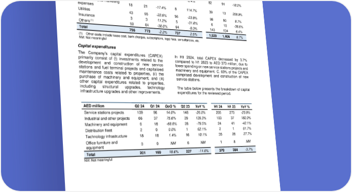 ADNOC Classification: Public AED million Q2 24 Q1 24 QoQ % Q2 23 YoY % H1 24 H1 23 YoY % Staff costs 399 393 1.5% 371 7.5% 793 733 8.2% Depreciation 191 177 7.7% 186 2.8% 368 336 9.7% Repairs, maintenance, and 43 39 11.9% 47 -8.4% 82 91 -10.2% consumables Distribution and marketing 18 21 -17.4% 8 114.7% 39 13 208.9% expenses Utilities 43 55 -22.6% 56 -23.9% 98 90 8.7% Insurance 3 3 11.2% 5 -31.6% 6 10 -36.6% Others (1) 59 84 -30.0% 64 -8.3% 143 134 6.4% Total 756 773 -2.2% 737 2.5% 1,529 1,406 8.7% (1) Other costs include lease cost, bank charges, subscriptions, legal fees, consultancies, etc. NM: Not meaningful Capital expenditures The Company’s capital expenditures (CAPEX) In H1 2024, total CAPEX decreased by 3.7% primarily consist of (i) investments related to the compared to H1 2023 to AED 370 million, due to development and construction of new service lower spending on new service stations projects and stations and fuel terminal projects and capitalized machinery and equipment. C. 60% of the CAPEX maintenance costs related to properties, (ii) the comprised development and construction of new purchase of machinery and equipment, and (iii) service stations. other capital expenditures related to properties, including structural upgrades, technology The table below presents the breakdown of capital infrastructure upgrades and other improvements. expenditures for the reviewed period. AED million Q2 24 Q1 24 QoQ % Q2 23 YoY % H1 24 H1 23 YoY % Service stations projects 109 96 14.0% 148 -26.0% 205 270 -23.9% Industrial and other projects 66 37 75.6% 29 129.3% 103 37 182.0% Machinery and equipment 6 18 -68.6% 28 -79.5% 24 41 -42.1% Distribution fleet 2 0 0.0% 1 62.1% 2 1 61.7% Technology infrastructure 18 18 1.4% 16 10.1% 35 28 27.7% Office furniture and 0 0 NM 6 NM 1 8 NM equipment Total 201 169 18.6% 227 -11.6% 370 384 -3.7% NM: Not meaningful 15 | P a g e